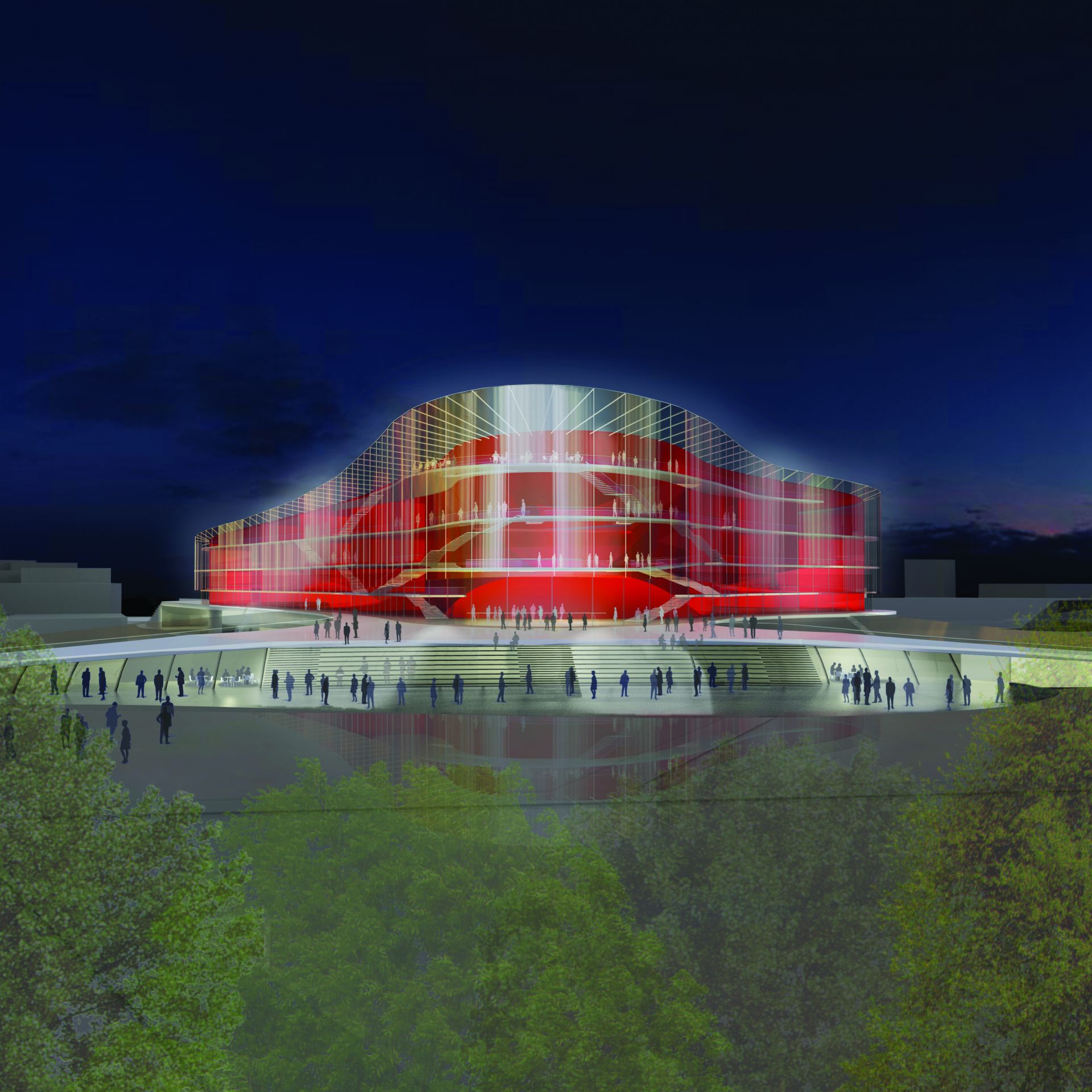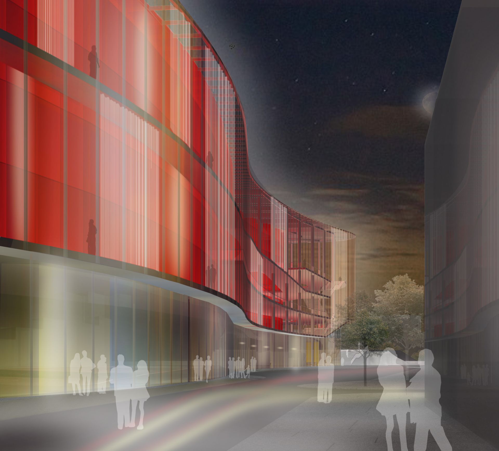 Die transparente Fassade vermittelt sowohl bei Tag als auch bei Nacht zwischen Theaterleben und Stadtleben. Der Betrachter nimmt von außen das Theaterleben wahr, die Neugierde auf einen Besuch wird dadurch erhöht.