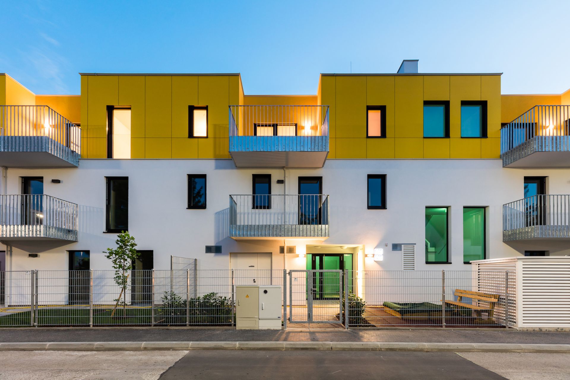 Die straßenseitige Fassade ist mittels einheitlicher Farbgebung, sowie einem stringenten Konzept der Fensteröffnungen und Hintanhalten von Vor und Rücksprüngen bewusst "ruhig" gehalten.