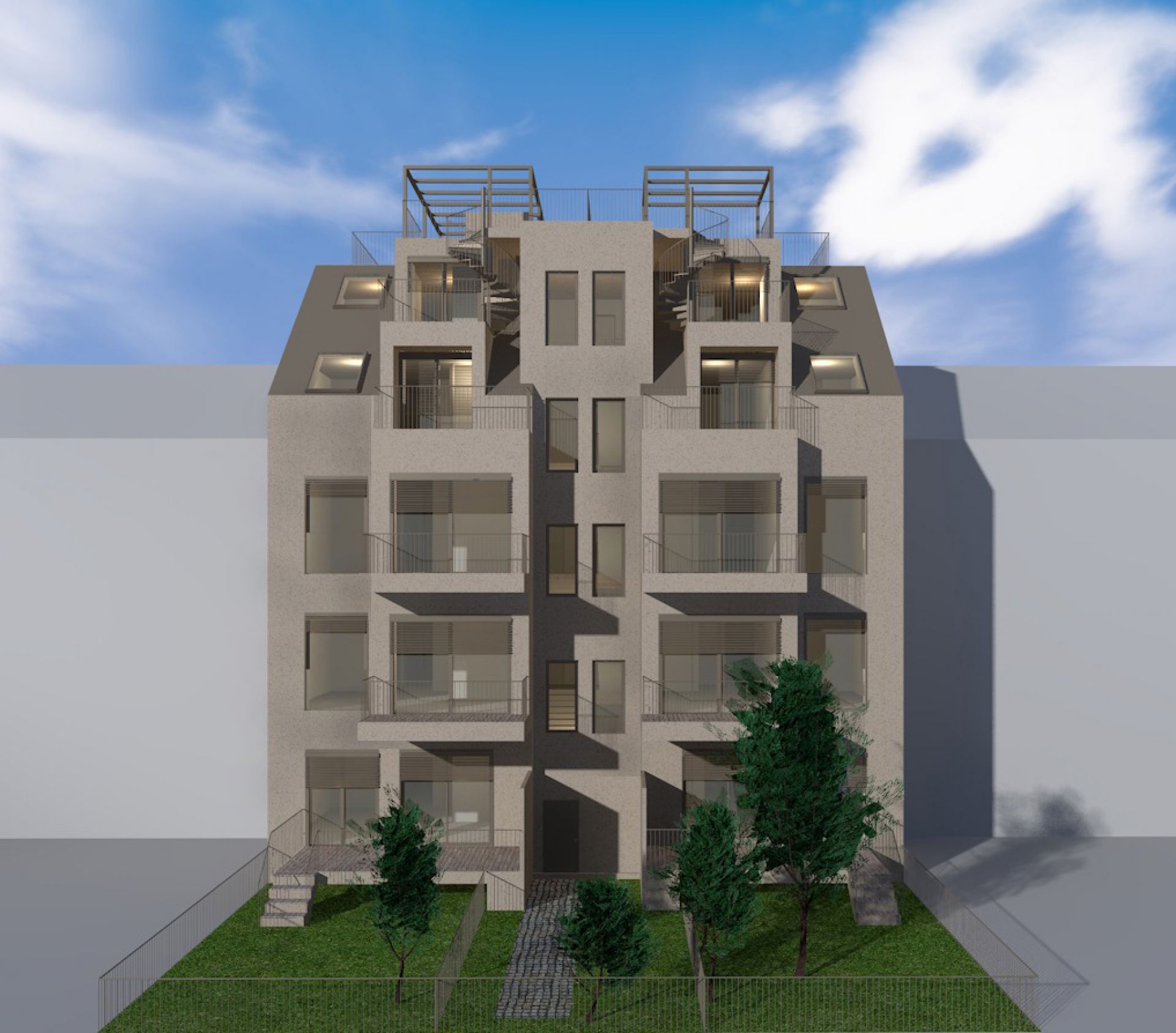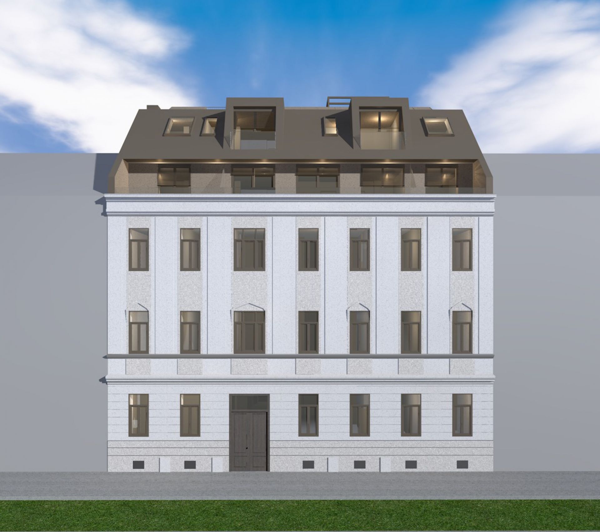 Das straßenseitige Gebäude (errichtet vor 1945) wird saniert und mittels neuer Wohnungskonzeptionen aufgewertet. Das Dach wird unter 45 Grad „aufgeklappt“ wodurch zwei Dachgeschosse ermöglicht werden. Die bestehende hofseitige Fassade wird mittels Unterzügen grösstenteils aufgelöst. Die hofsseitige bauliche Ergänzung ist in Stahlbetonbauweise konzipiert, die bestehenden Decken werden teilweise durch Verbundbauweise ertüchtigt. Der Dachgeschossaufbau ist mittlels einer Stahl-Rohbaukonstruktion angedacht.