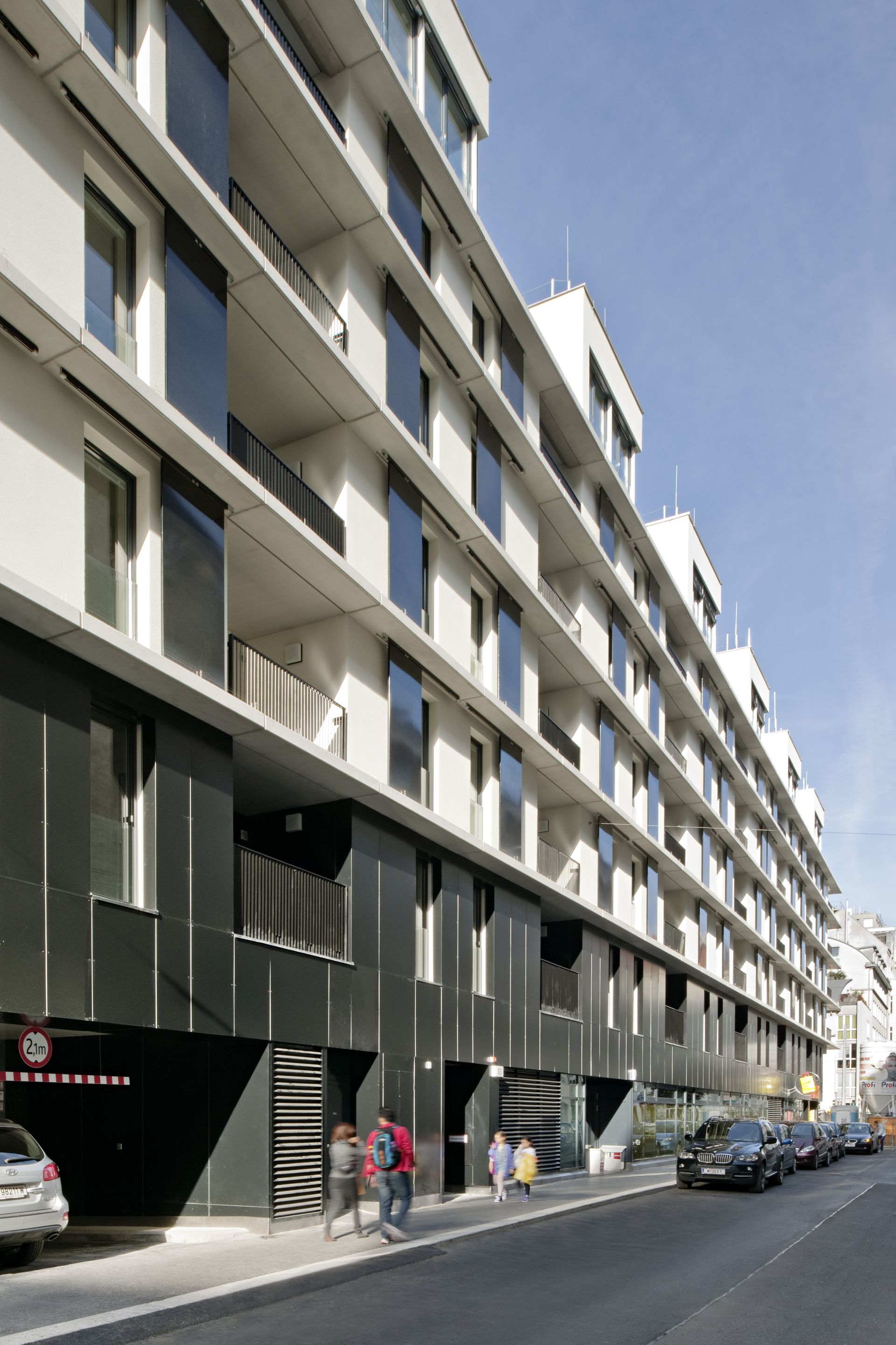 Das Wohngebäude befindet sich im hippen siebten Bezirk von Wien. Sämtliche Wohnungen zeichnen sich durch wohlproportionierte Grundrisse aus und verfügen über Balkone, Loggien und Terrassen. Die Penthousezone ist kubisch durchgebildet und nimmt besonderen Bedacht auf schöne Ausblicke und verhindert gegenseitige Einsichtnahme. Der urbane Charakter des Gebäudes wird durch den erdgeschoßigen Einkaufsmarkt unterstrichen.